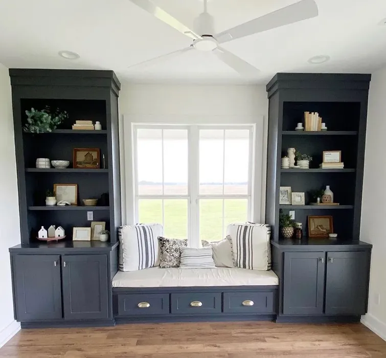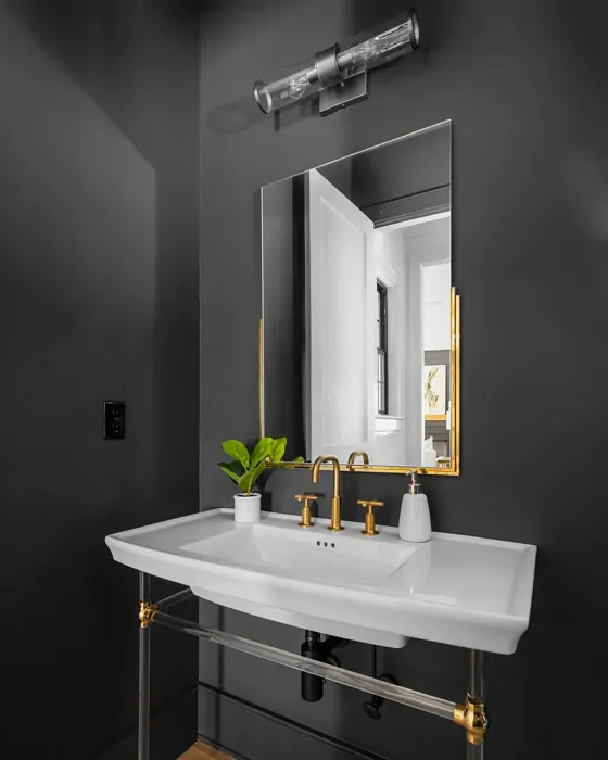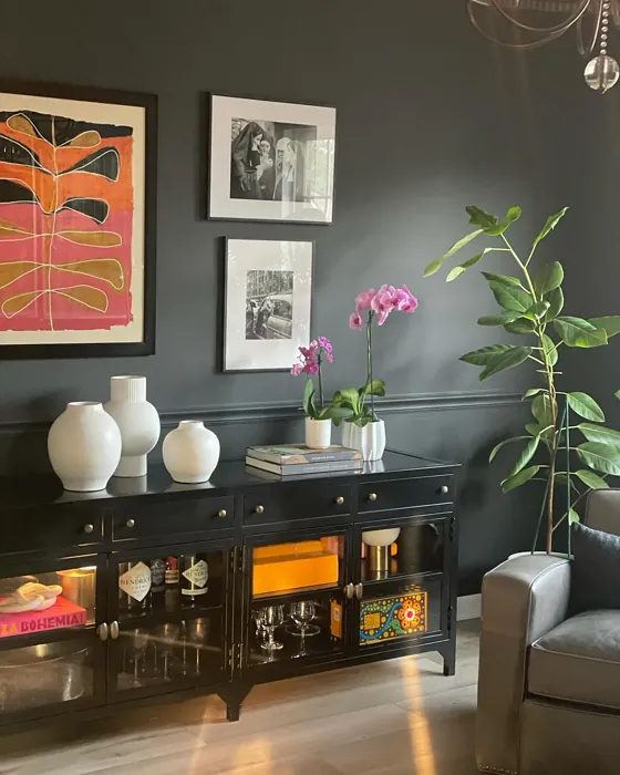 Speaking of trim, Cheating Heart plays well with a variety of finishes. For a classic look, pair it with Benjamin Moore’s White Dove or Simply White—the contrast keeps things fresh and bright. If you’re feeling bold, black windows or natural wood trim add a modern, industrial edge. The key is balance. Since this is a deep color, you’ll want to balance it with lighter furnishings, metallic accents, or plenty of texture to keep the room from feeling too heavy.