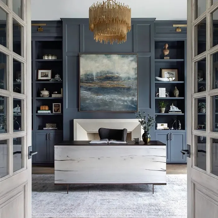 The Light Reflectance Value (LRV) of 14.13% tells us this color reflects very little light, placing it firmly in the medium-dark category. That means it’s perfect for creating an intimate, enveloping atmosphere. If you’re working with a smaller room, don’t shy away—Ocean Floor’s cool undertones can actually make a space feel more open and airy, especially when paired with plenty of natural light or crisp white trim. Speaking of pairings, this color plays well with others. For a clean, timeless look, try it alongside Benjamin Moore’s White Dove or Simply White. If you want warmth, introduce natural wood tones or brass fixtures, which add a beautiful contrast to its cool base.