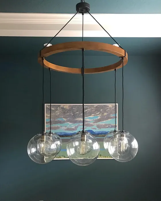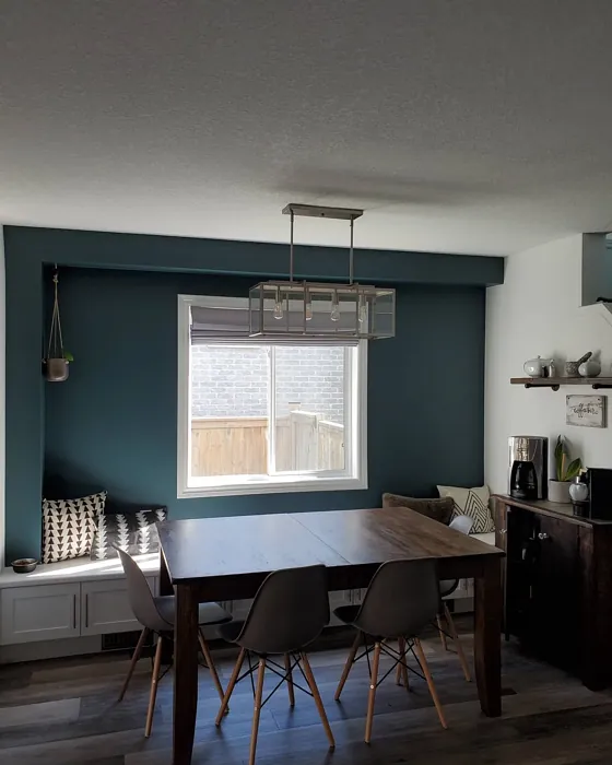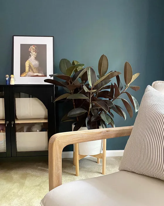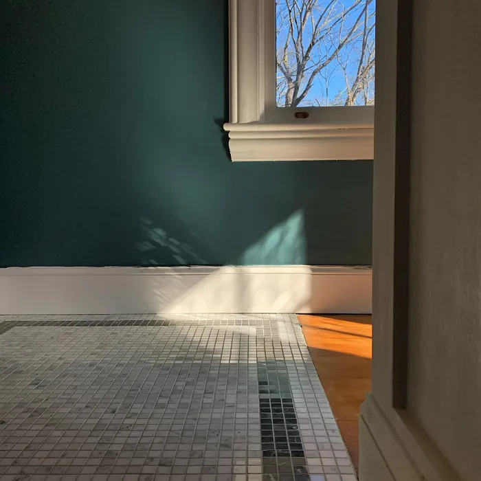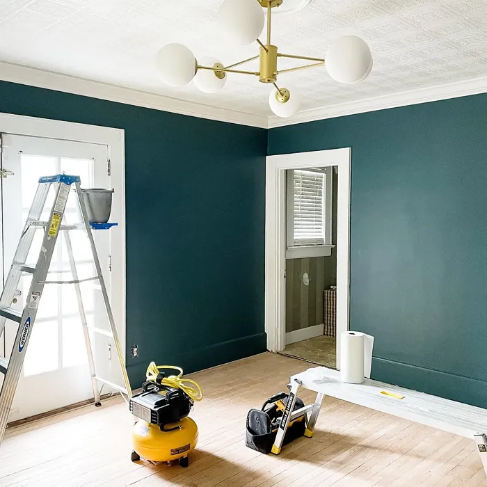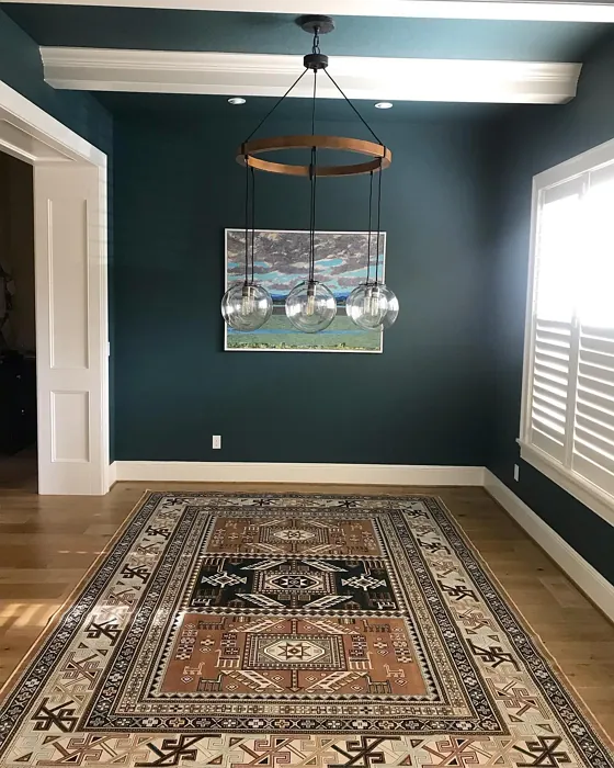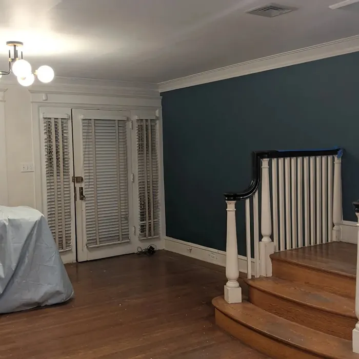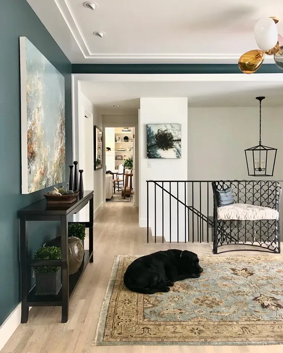One of the standout qualities of this color is its ability to adapt to different lighting conditions. In natural light, the blue undertones come forward, giving it a fresh, vibrant feel. As the light fades, it takes on a deeper, moodier tone that’s perfect for creating a relaxing atmosphere in bedrooms or home offices. That said, if you’re using it in a small or poorly lit room, pair it with lighter trim—like Benjamin Moore’s White Dove—to keep the space from feeling too closed in. The contrast between the deep teal and crisp white trim is absolutely stunning and adds a modern edge.