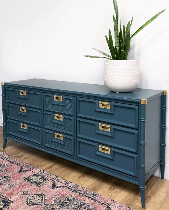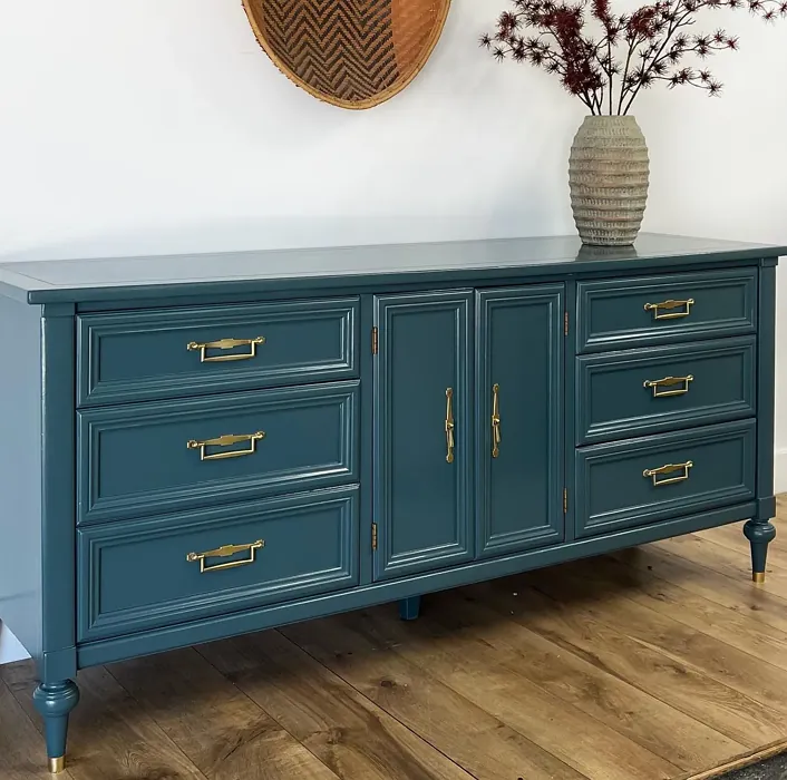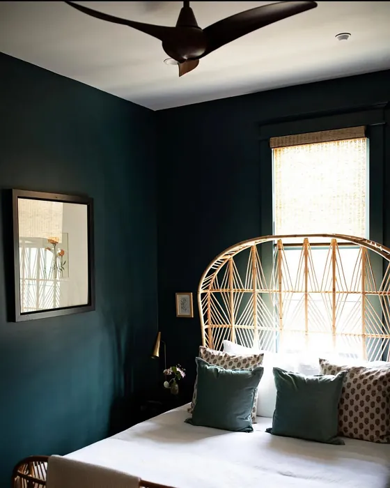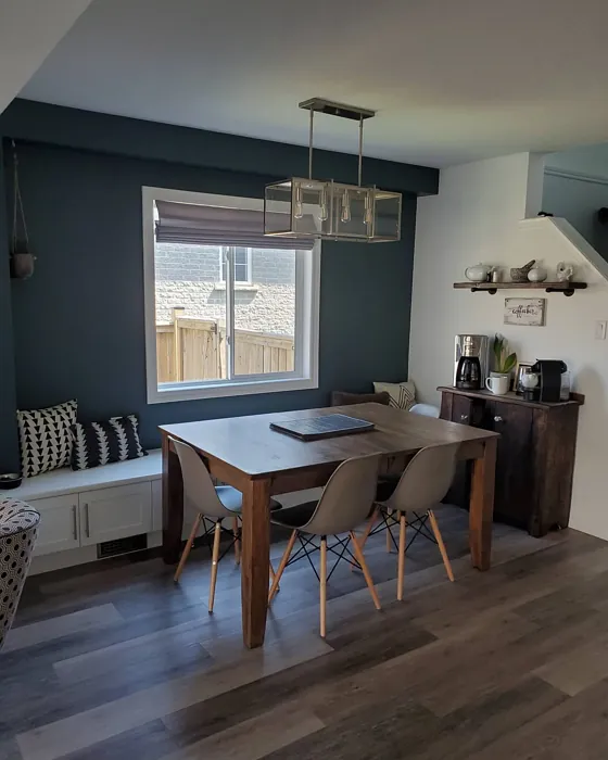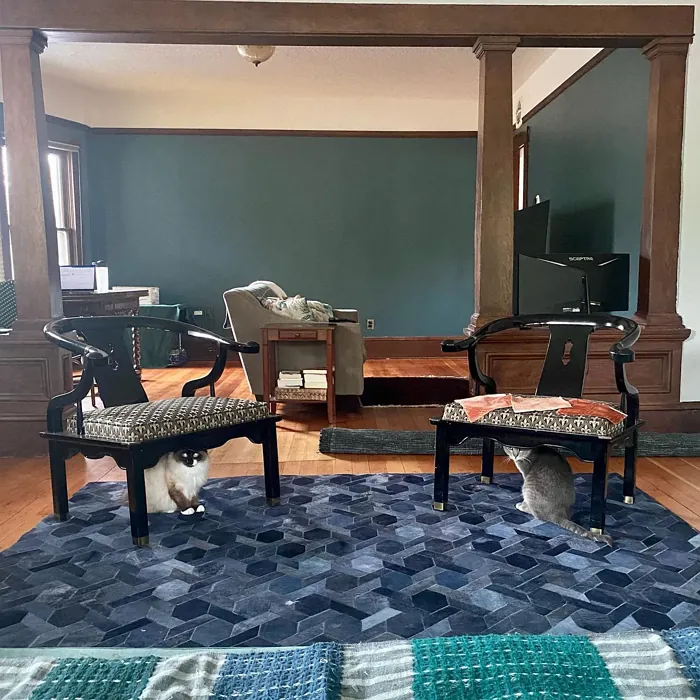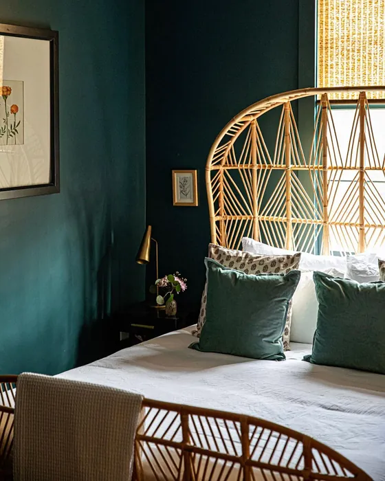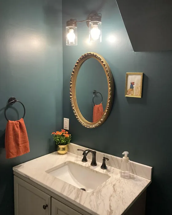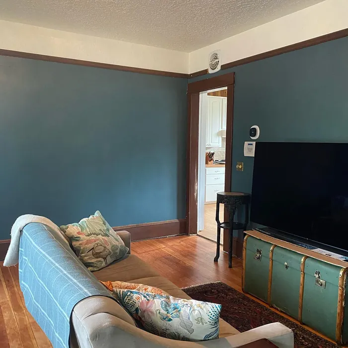 One of the standout qualities of this color is its ability to adapt to different lighting conditions. In natural light, the blue undertones come forward, giving it a fresh, vibrant feel. As the light fades, it takes on a deeper, moodier tone that’s perfect for creating a relaxing atmosphere in bedrooms or home offices. That said, if you’re using it in a small or poorly lit room, pair it with lighter trim—like Benjamin Moore’s White Dove—to keep the space from feeling too closed in. The contrast between the deep teal and crisp white trim is absolutely stunning and adds a modern edge.