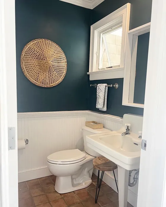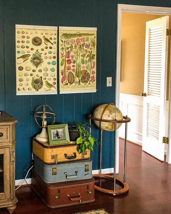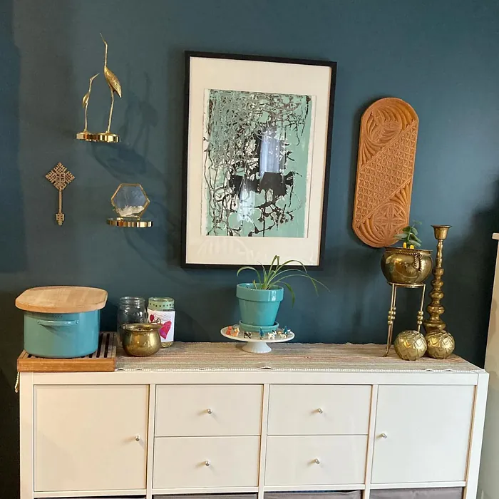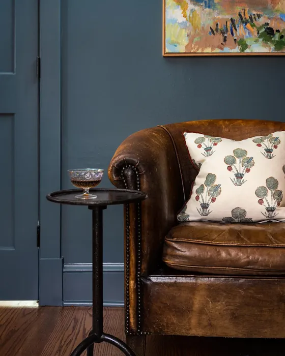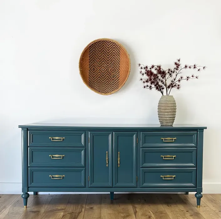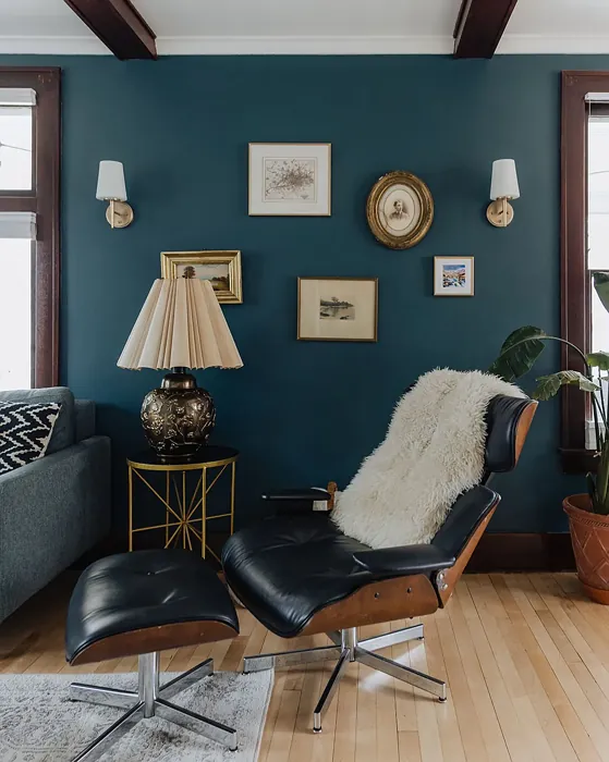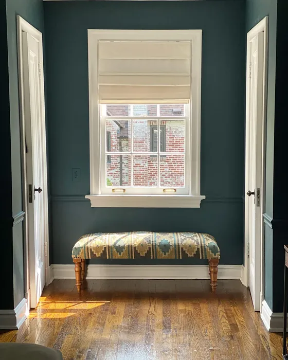Newburg Green is one of those rare hues that adapts to its surroundings. In natural light, it softens to a serene, almost misty green-blue, while under artificial lighting, it deepens into a cozy, enveloping tone. That’s the magic of its 10.58% Light Reflectance Value (LRV)—it absorbs light rather than bouncing it back, creating an intimate atmosphere. This makes it ideal for rooms where you want to cultivate warmth and depth, like living rooms, bedrooms, or even a home office where focus and relaxation are key. Just keep in mind that because it’s on the darker side, it works best in spaces with decent natural light or well-planned artificial lighting.