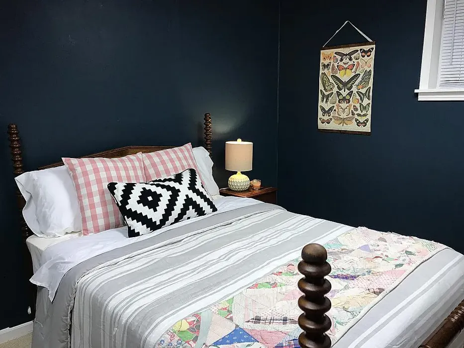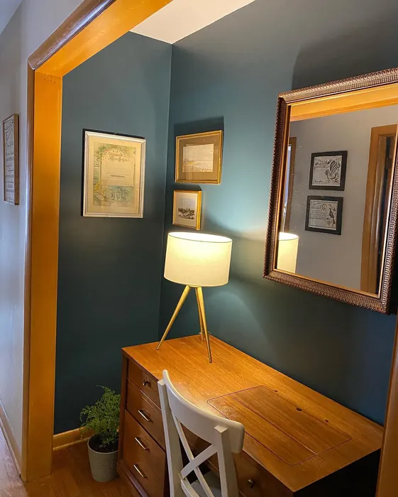 Worried about using a dark color in a small room? Don’t be. Newburg Green can actually make compact spaces feel more inviting and intentional. Pair it with crisp white trim (Benjamin Moore’s White Dove is a classic choice) or light-colored furniture to keep the room from feeling too heavy. The contrast between the deep walls and airy accents creates a balanced, layered look. And if you’re not ready to commit to painting an entire room, consider using it on an accent wall or even a piece of furniture—it’s a great way to test the waters without overwhelming the space.